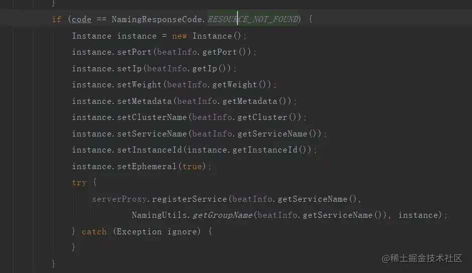 首先就是通过serverProxy发送一个http请求到服务端,服务端进行响应,其实这个过程就完成了跟服务端的心跳,接下来就是解析服务端的响应的数据了。根据服务端返回的不同的状态码进行判断,进行不同的操作。这里我们着重看一下这个响应码RESOURCE_NOT_FOUND (资源未找到)对应的操作