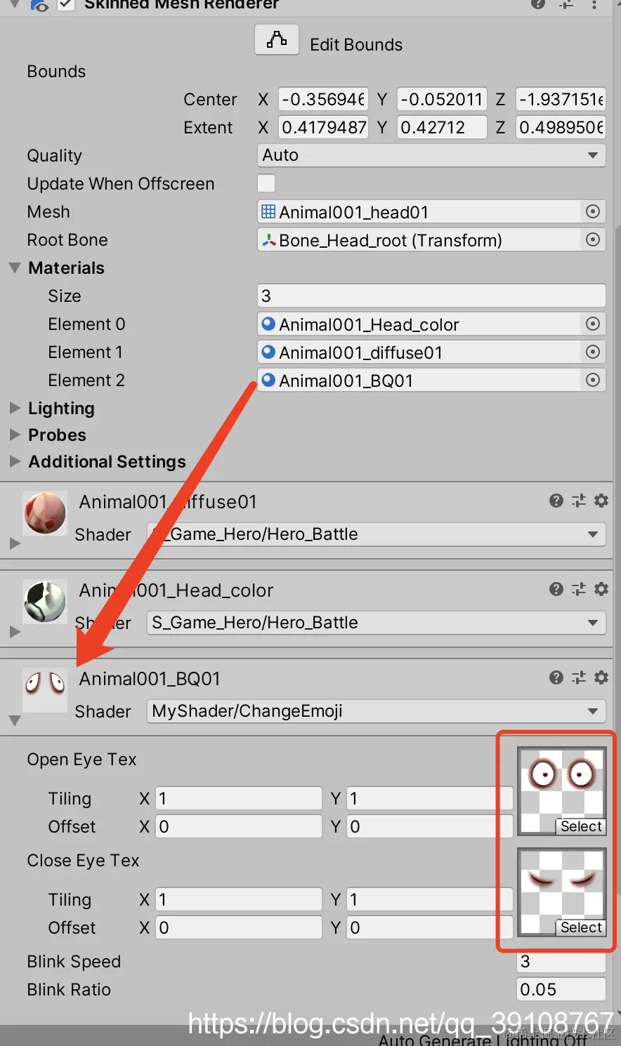 眼睛部分单独作为一个材质球,准备一张睁眼一张闭眼的贴图,在shader中自动切换贴图,实现眨眼效果