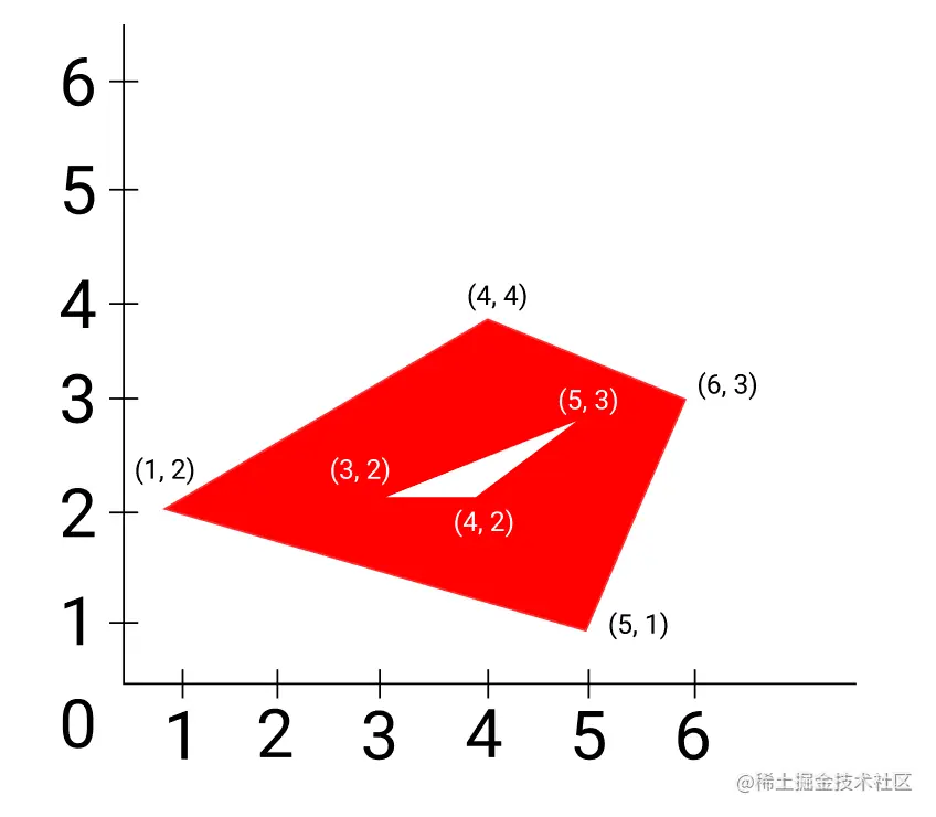 里面的白色三角形是一个环。图中包含了外部多边形内但在白色区域外的区域(红色阴影的区域被包含)。