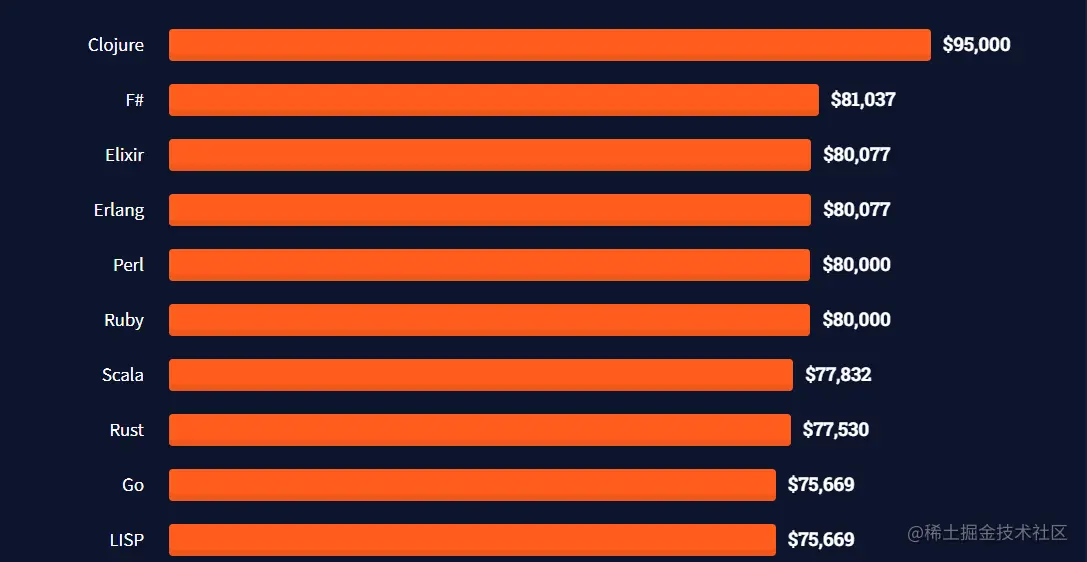 在前一年成为收入最高的语言之后,Perl今年的薪酬从第一降到了第五。Clojure开发人员的收入最高,中位数比F#开发人员多14000。