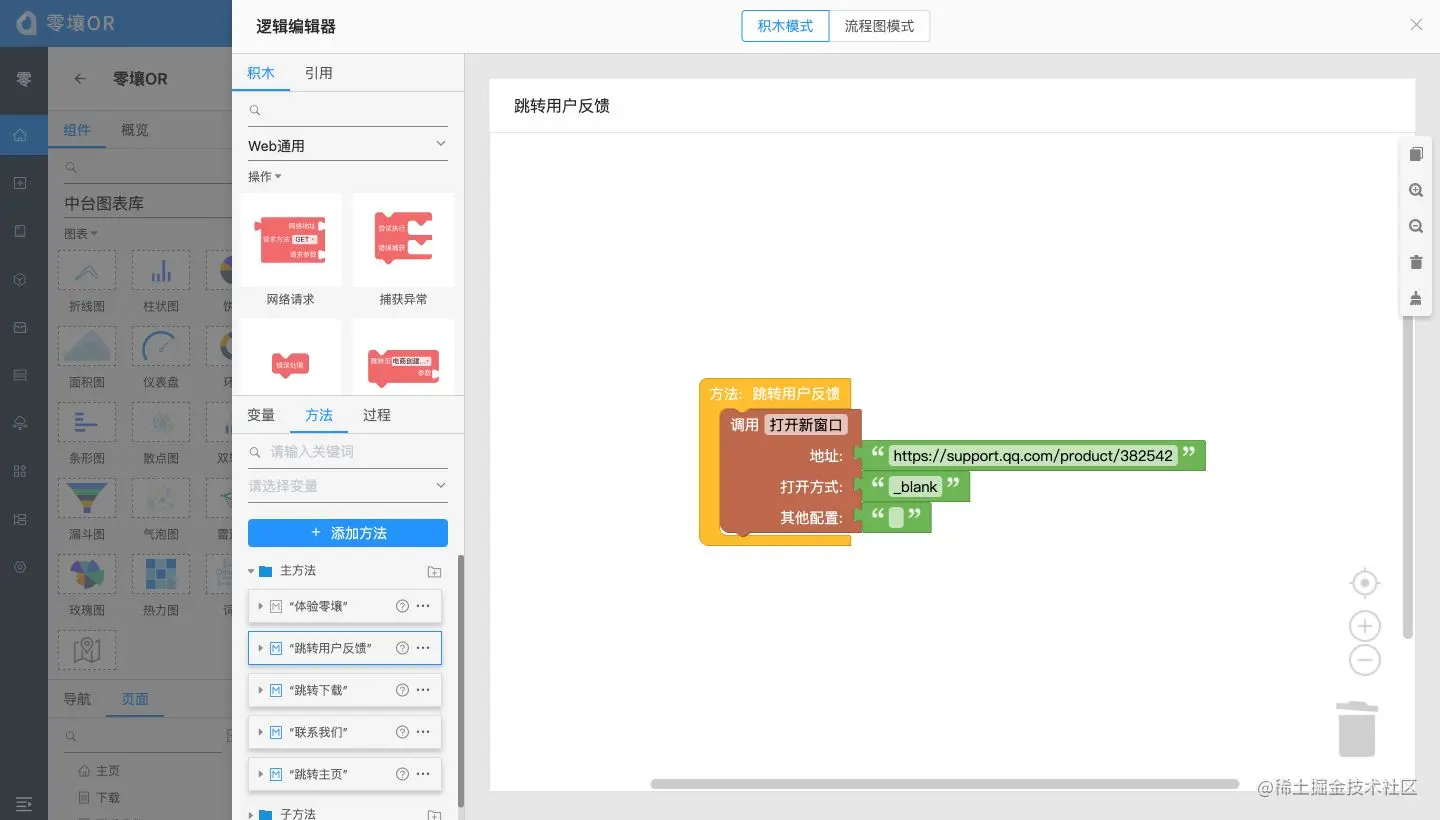 积木模式,基于Google的Blockly项目进行了大量的改造和优化,使其可以实现我们的所有业务逻辑设计需求,比如零壤官网的的反馈链接,需要打开一个新窗口,使用我们的积木工具可以这样实现: