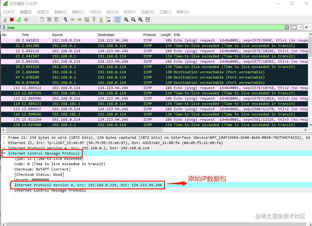 从上图可以看出,tracert 就是发一个 ICMP (ping) 包,把IP层的TTL 设置成 1,这样在第一层路由 192.168.0.1 的时候,TTL 就会变成 0,192.168.0.1 的路由器就会发一个 ICMP 回来,说TTL 过期了,这个回来的ICMP 里面还嵌套了一个原始的IP数据包。