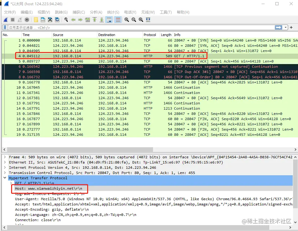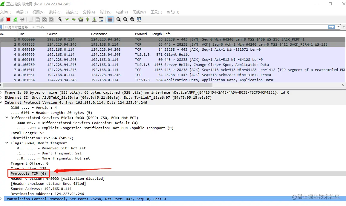 IP包里面的目的IP确实是 124.223.94.246,但是是因为 IP包 要经过转发才能到达目的IP,这个转发是MAC 层的事情,首先,本地电脑要把 IP包封装进去 MAC 层,MAC 层也有一个 源地址跟目的地址,MAC 层的目的地址如何获取,就是通过查 路由表,子网掩码,网关之类的操作,拿到这个IP包对应的MAC层目标地址。在上图中,是TP-link的一个MAC 地址,我的路由器是 TP-link。