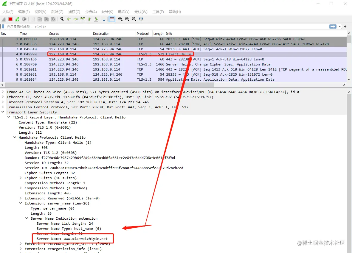 虽然 TLS 把 HTTP 包加密了,但是 TLS 协议本身,是设计了一个字段来存域名的,也就是 Client Hello 包里面的 server_name,如图: