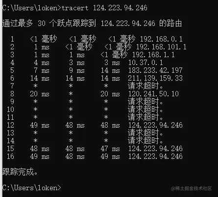 linux 下可使用 traceroute 124.223.94.246,Windows下可使用 tracert 124.223.94.246 ,如图: