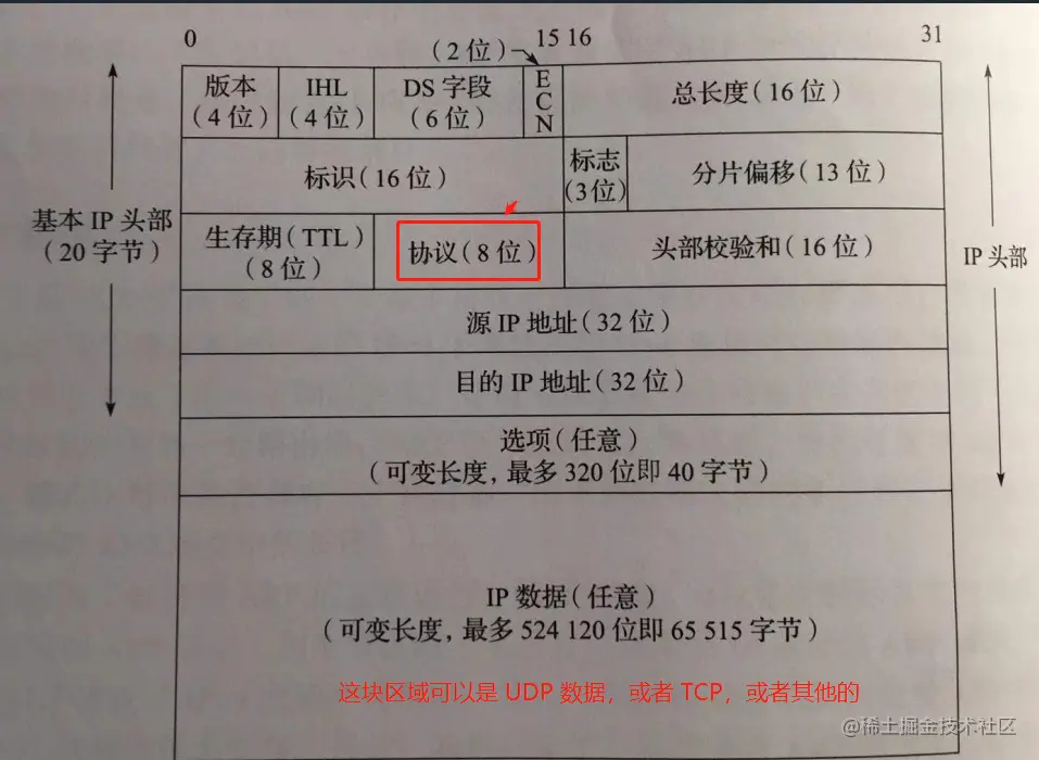 IP 头部里面的 协议(8位) 代表 IP body 里面是哪个协议的数据,如果是 06 ,IP body 里面就是 TCP 的数据,如下图: