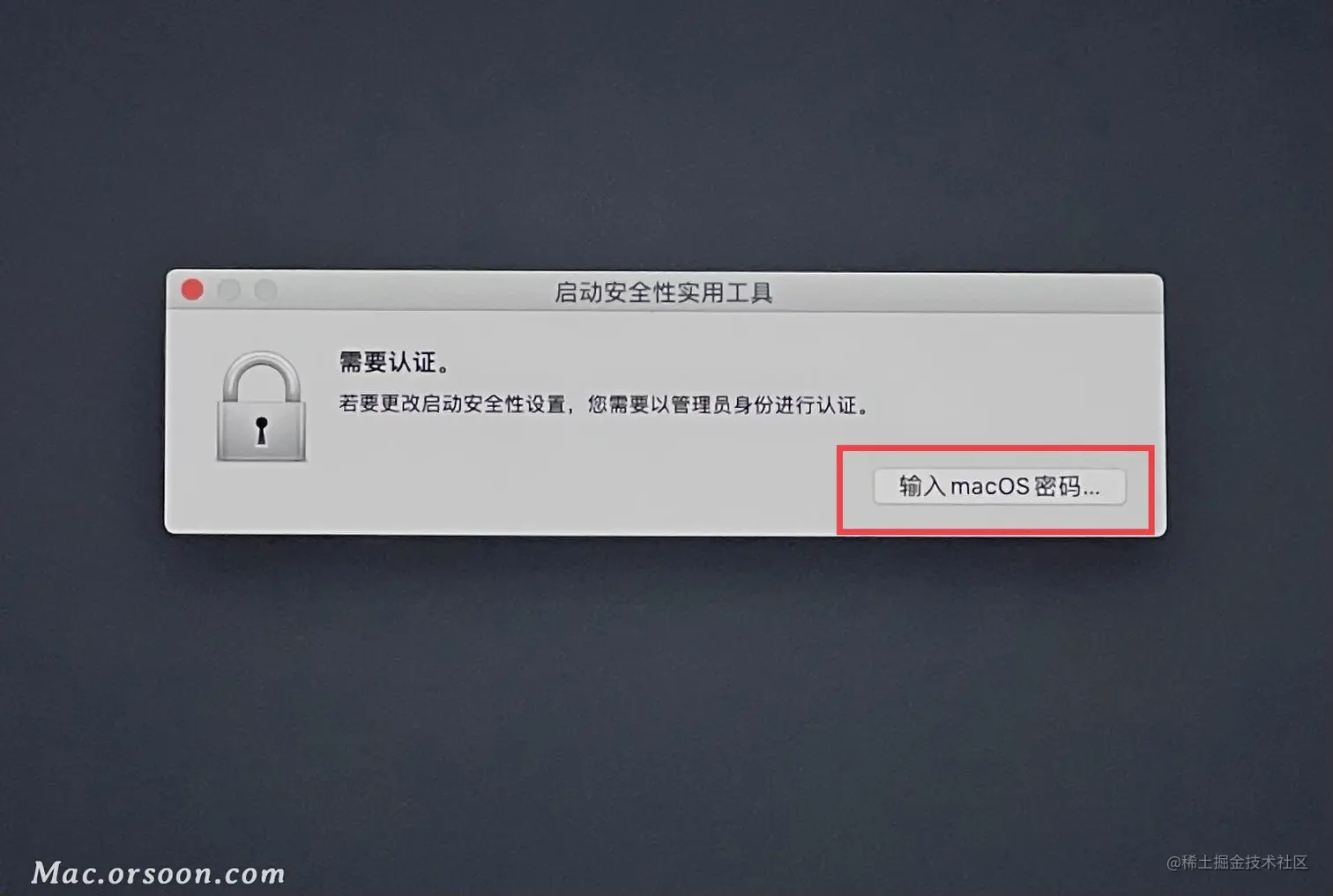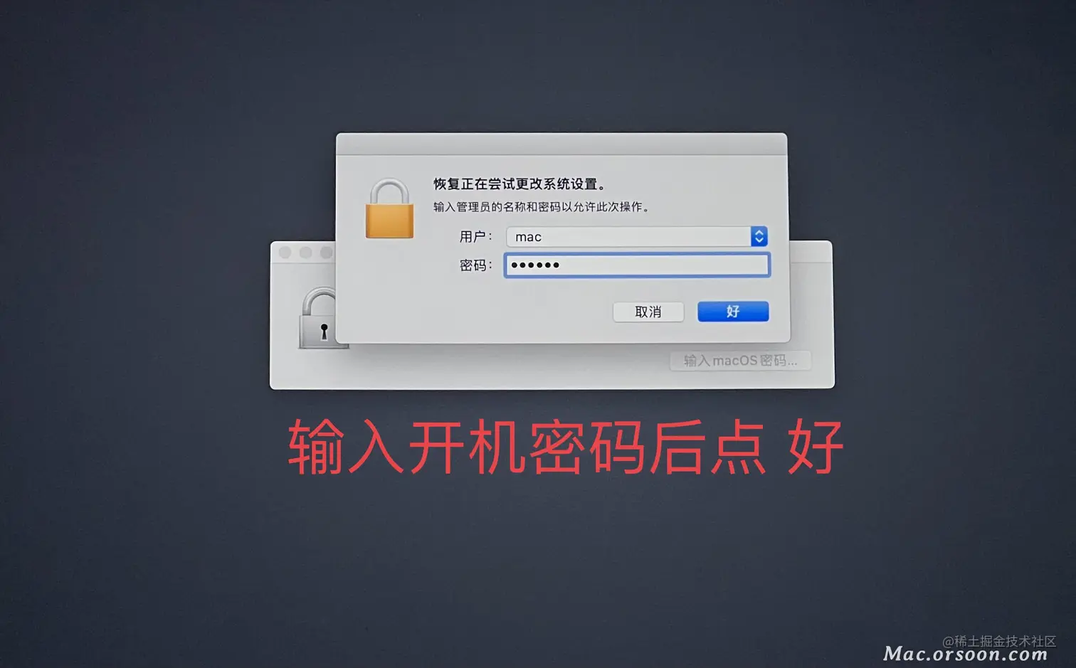 - 输入MacOS密码,这个密码就是 你电脑的 开机密码