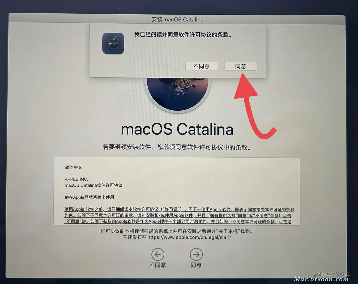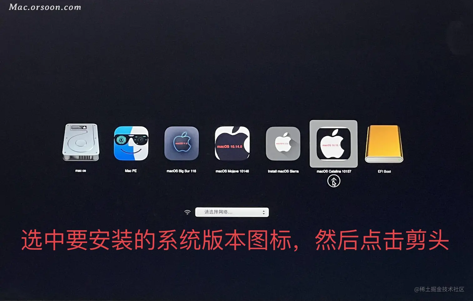 - 又来到一开始时的界面,点选要安装的系统版本,我这里选择10.15.7,然后点那个向上的箭头