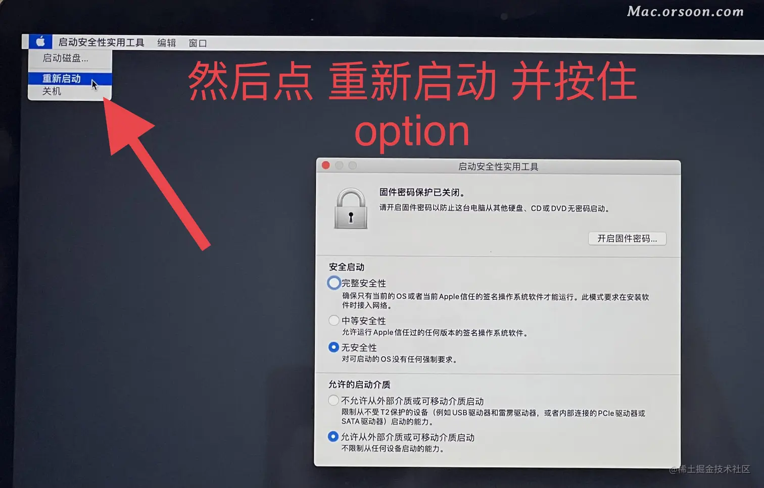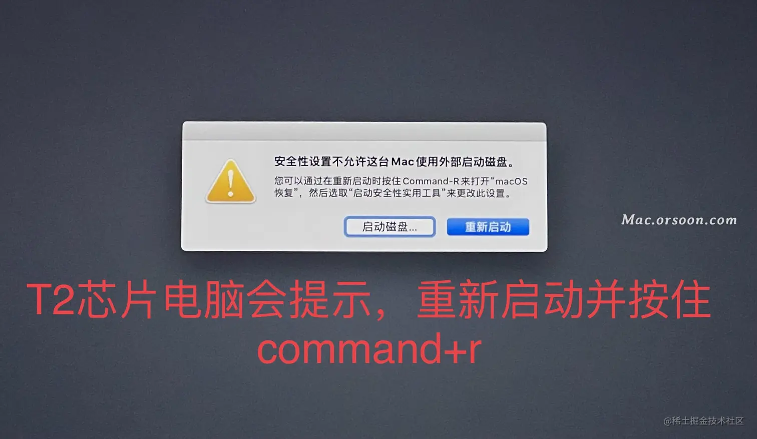 4 .然后回弹出下面的提示:这也是T2芯片独有的提示,按照要求来做,我们点击 重新启动 同时按住 command 和 R