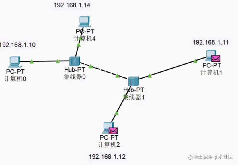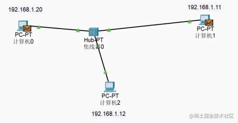 - 响应消息要先经过集线器,然后集线器真的是没有智商,它只负责将各个计算机连接起来,然后它会把响应消息同时发送给计算机0和计算机1