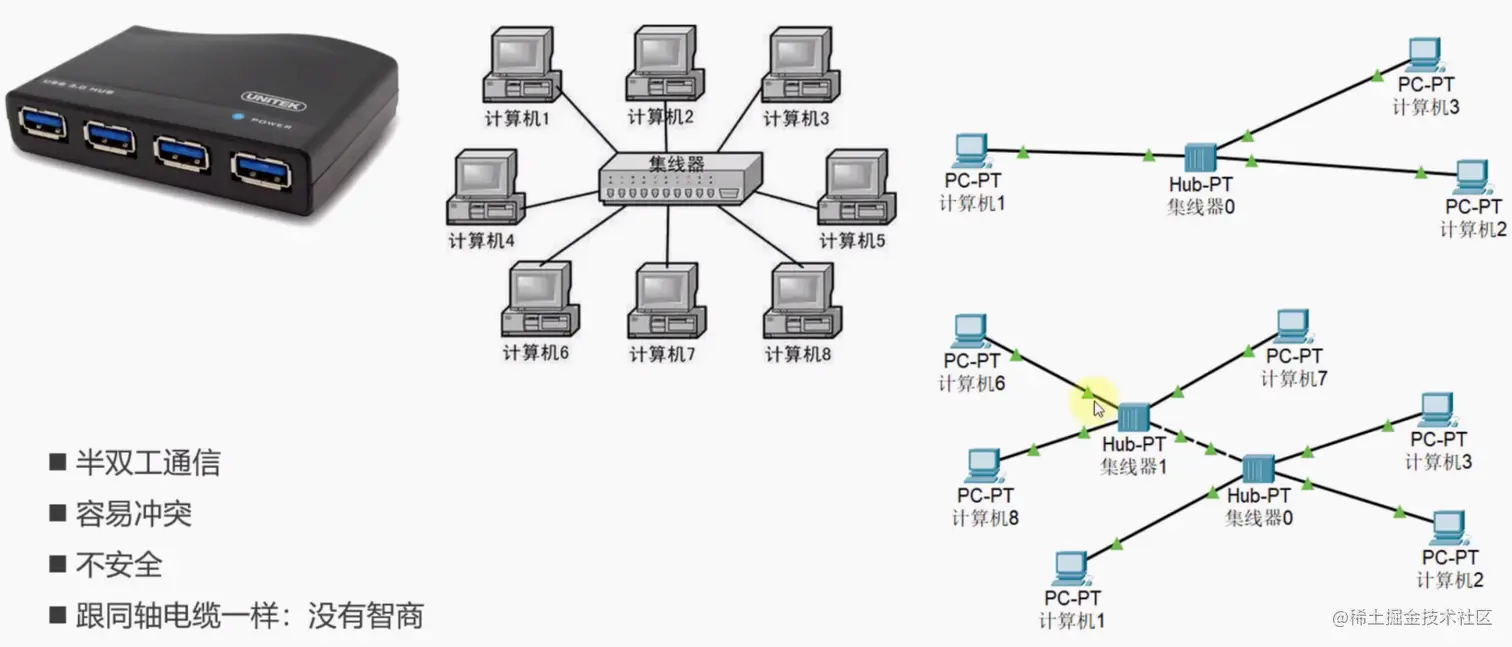 - 跟同轴电缆一样没有智商,也就是说即使不是目标网卡,也有可能会受到请求消息
