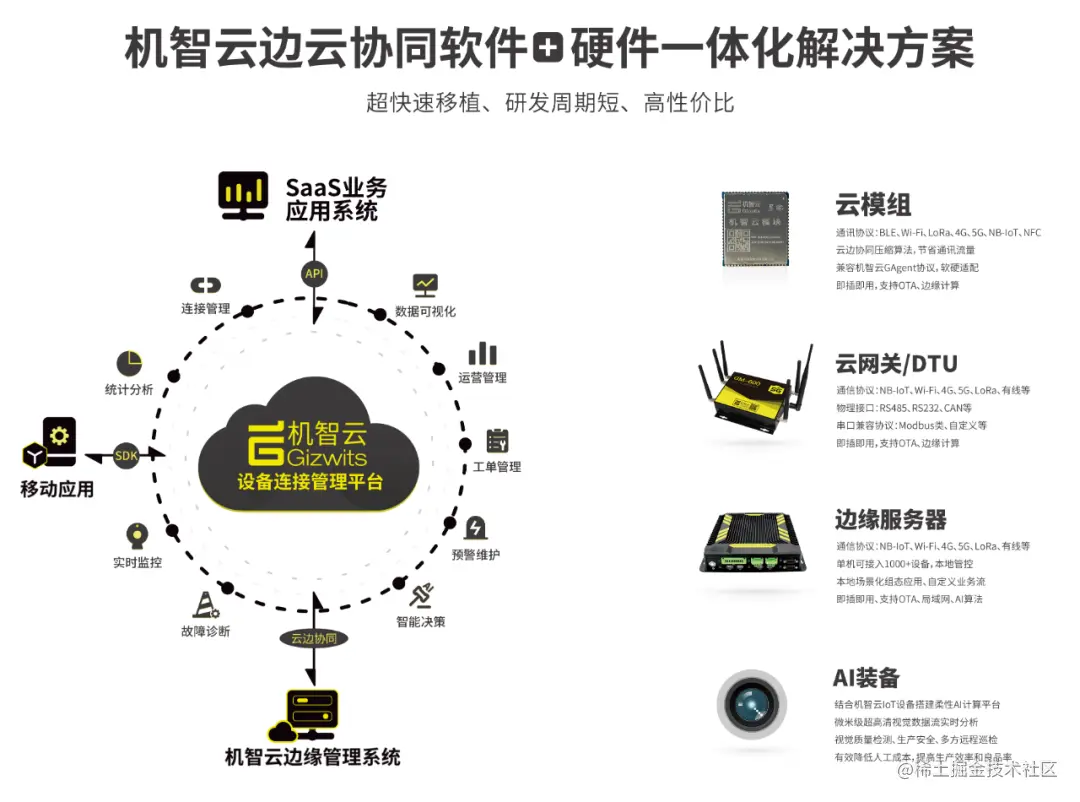 横向上,以机智云AIoT自助开发平台为核心,机智云依托软硬件复合的创新能力、边云智能协同能力,结合全球最大的开发者生态社区,以及开放的生态网络、深入的行业理解、扎实可靠的产业经验,通过PaaS平台物联网+边缘计算能力+数据垂直一体化,提高物联网硬件使用效能,降低元器件依赖,帮助客户低成本打通从智能化设计到数字化、信息化、智能化商用全流程。