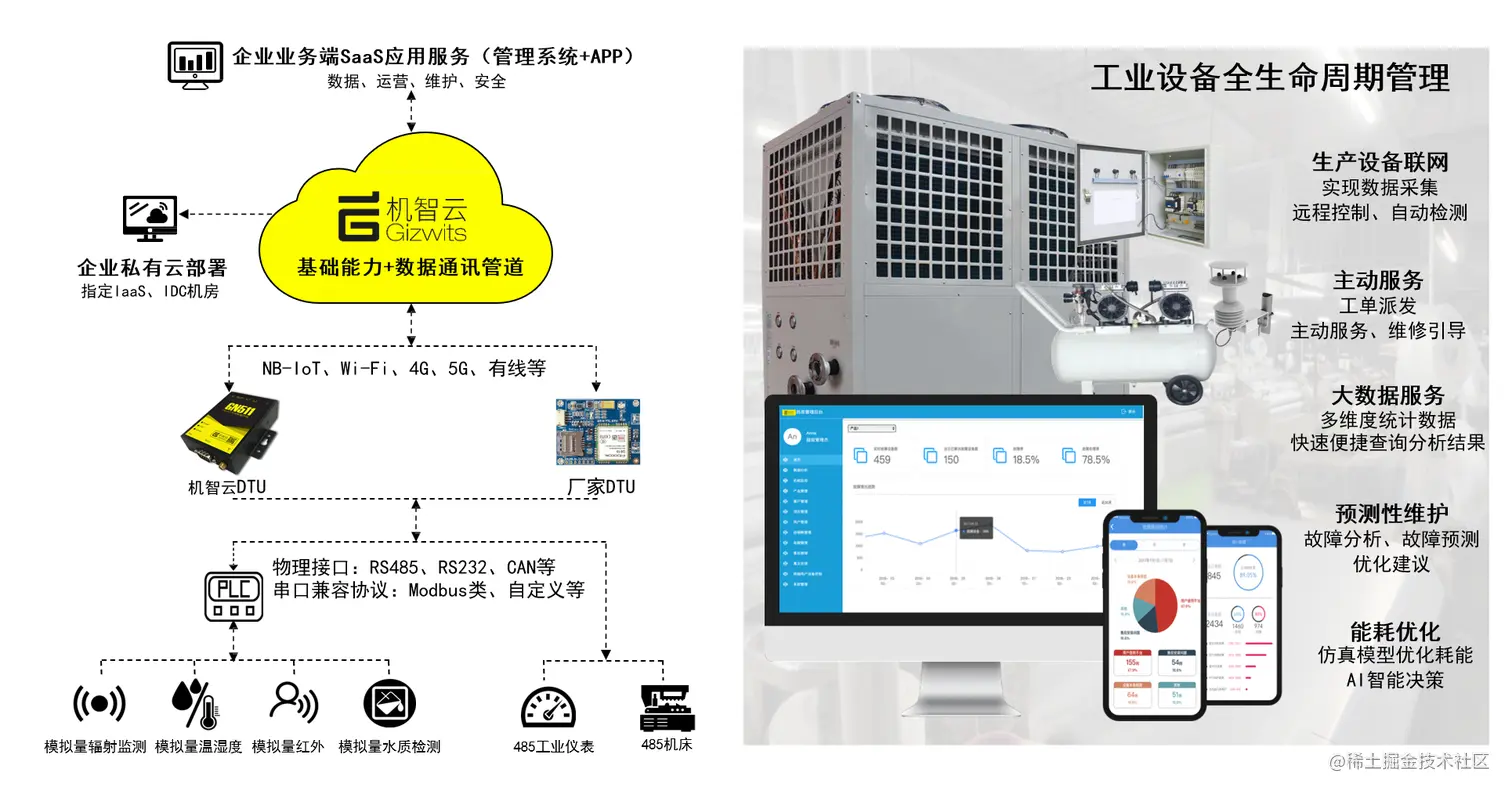 **面对种类繁多的跨行业跨品类工业产品,通过开放的机智云AIoT云平台可实现快速接入。**平台采用微服务架构,在云端部署可自由组合的应用组件,实现设备接入与管理、海量工业实时数据分析。架构灵活可横向扩展,支持云端协议解析与转换、中间件等技术,兼容主流工业通信协议,具备AI边缘计算能力,支持云边协同、开放API,满足企业设备物联、数据采集分析、远程运维、预测性维护、资产管理、AI服务等工业应用服务。