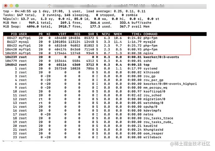可以简单实用top命令,然后访问网站,就会动态出现内存占用的程序,学会分析他们