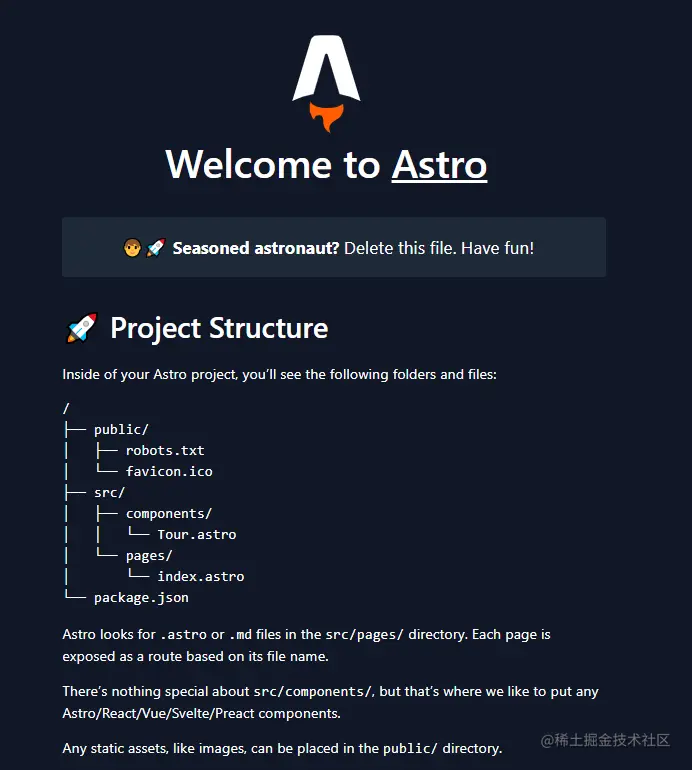 这将打开一个新的浏览器标签,上面有Astro的欢迎页面。Astro有自己的VScode语言支持扩展,它将启用语法高亮和其他语言选项。