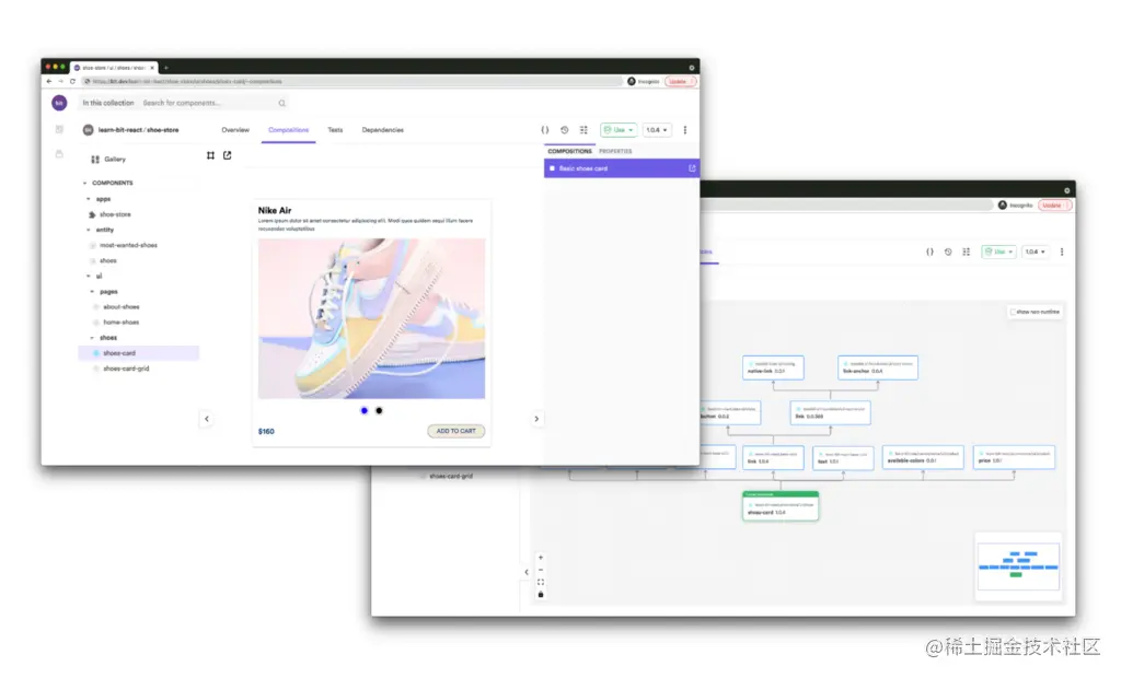 一个独立的源码控制和共享的 "卡 "组件(右边是它的依赖关系图,由Bit自动生成的