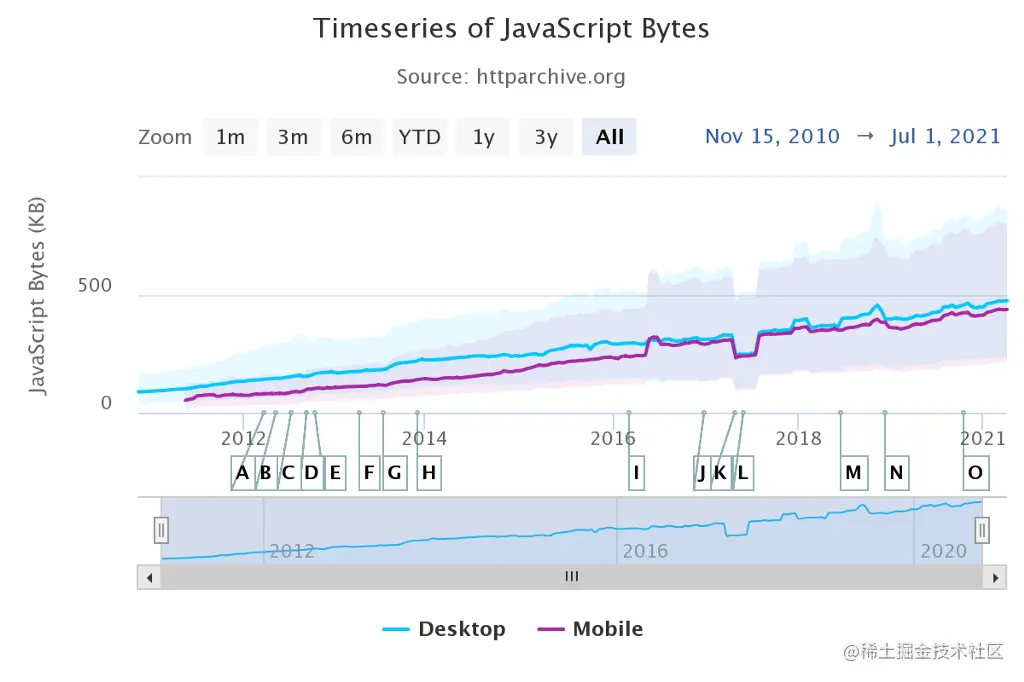HTTP Archive Org的下图向你展示了,一般来说,JavaScript捆绑大小在这些年里的增长情况。