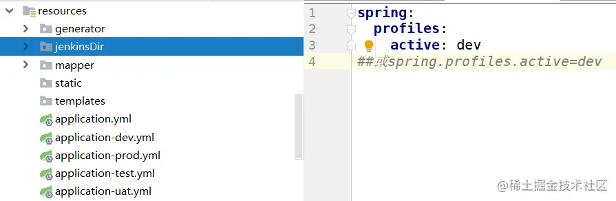 如上图新建 application-dev.yml、application-test.yml、application-uat.yml、application-prod.yml 四套配置文件环境,我们在四套配置文件中将设置服务端口号分别设置为 8091/8092/8093/8094。