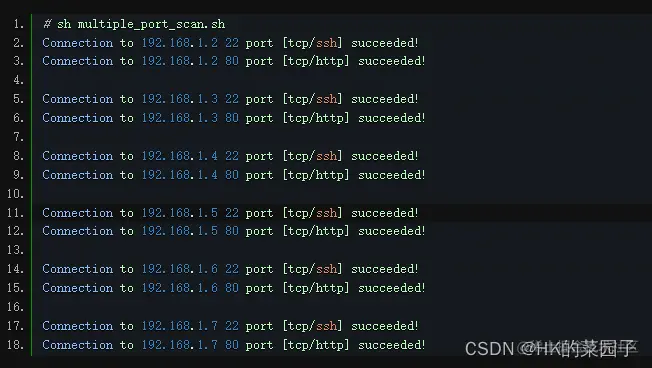 # sh port_scan.shConnection to 192.168.1.2 22 port [tcp/ssh] succeeded!Connection to 192.168.1.3 22 port [tcp/ssh] succeeded!Connection to 192.168.1.4 22 port [tcp/ssh] succeeded!Connection to 192.168.1.5 22 port [tcp/ssh] succeeded!Connection to 192.168.1.6 22 port [tcp/ssh] succeeded!Connection to 192.168.1.7 22 port [tcp/ssh] succeeded!