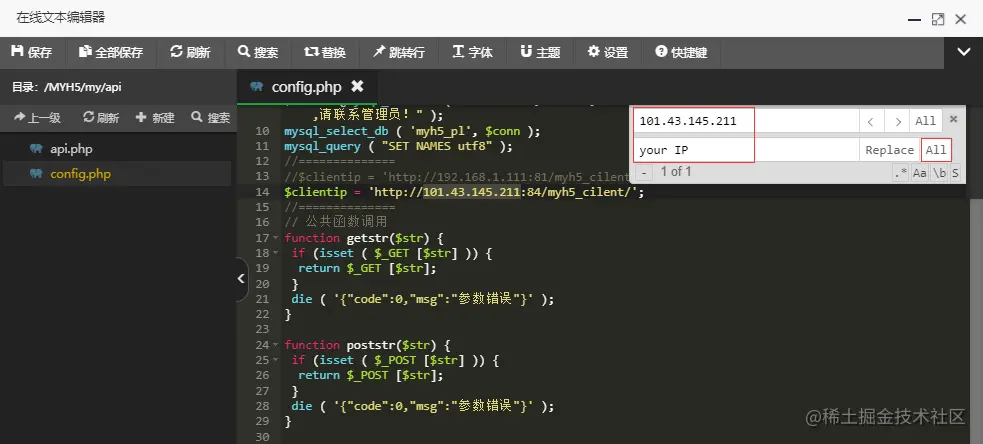 以config.php文件为例,在宝塔中找到文件,双击修改,Ctrl+F批量替换IP。