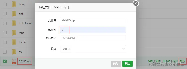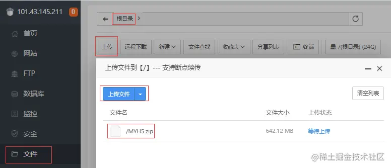 拿到源码后,将MYH5.zip压缩文件通过宝塔上传到根目录(如果宝塔禁止上传到根目录,可上传其他路径后剪切粘贴到根目录)。