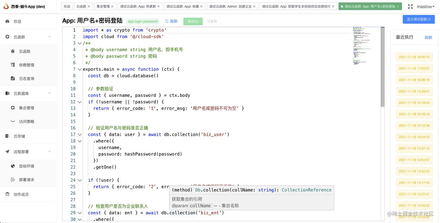 - 提供云开发控制台,在线管理云函数、文件、数据库、远程部署、日志,在线编写、调试云函数,全智能提示 IDE。