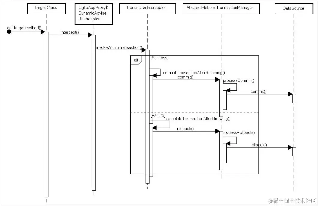 在应用系统调用声明@Transactional 的目标方法时,Spring Framework 默认使用 AOP 代理,结合AOP和事务元数据(注解)在代码运行时生成一个代理对象,根据@Transactional 的属性配置信息,这个代理对象决定该声明@Transactional 的目标方法是否由拦截器 TransactionInterceptor 来使用拦截,在 TransactionInterceptor 拦截时,会在目标方法开始执行之前创建并加入事务,并执行目标方法的逻辑, 最后根据执行情况是否出现异常,利用抽象事务管理器AbstractPlatformTransactionManager 操作数据源 DataSource 提交或回滚事务。