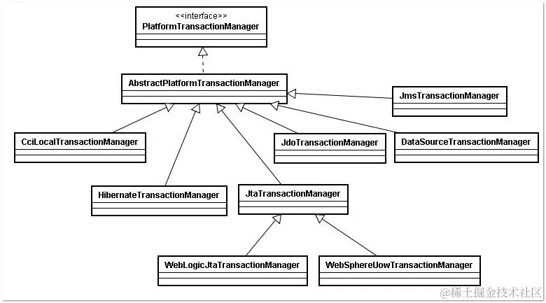 事务管理的框架是由抽象事务管理器 AbstractPlatformTransactionManager 来提供的,而具体的底层事务处理实现由 PlatformTransactionManager 的具体实现类来实现,如事务管理器 DataSourceTransactionManager。不同的事务管理器管理不同的数据资源 DataSource,比如 DataSourceTransactionManager 管理 JDBC 的 Connection。