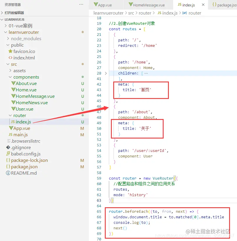 - 其次,利用导航守卫修改我们的标题