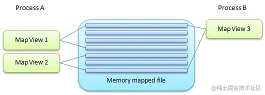 在多个进程之间进行共享(进程可通过使用由创建同一内存映射文件的进程所指派的公用名来映射到此文件)。