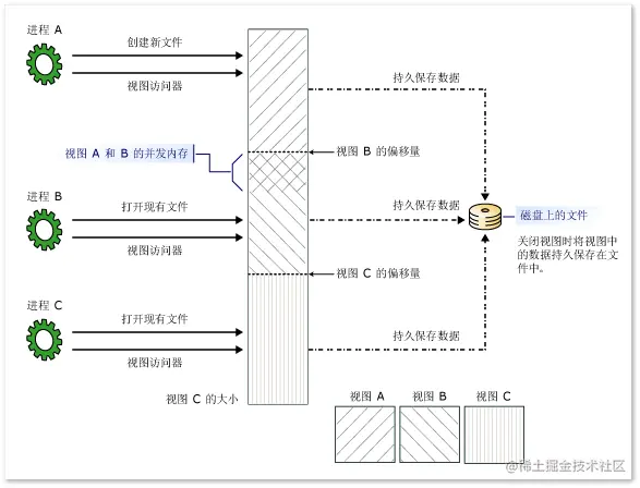 如果文件大于应用程序用于内存映射的逻辑内存空间(在 32 位计算机上为2GB),则还需要使用多个视图。