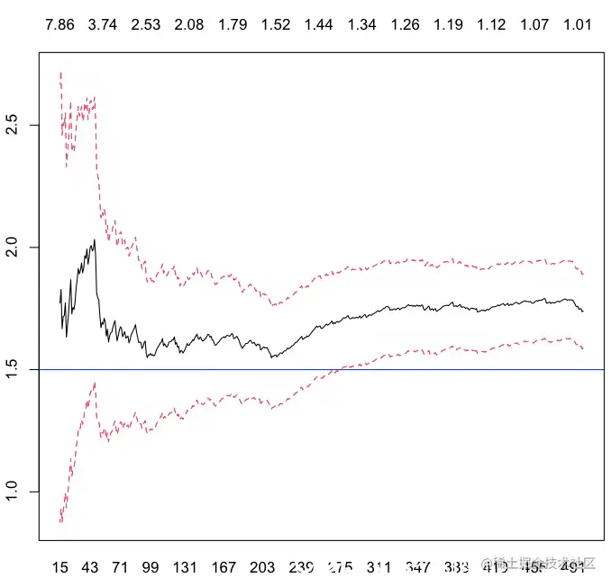 这个结果的直观解释是,如果 太大,并且如果基础分布不完全 是帕累托分布,那么希尔估计量是有偏的。这就是我们所说的意思
