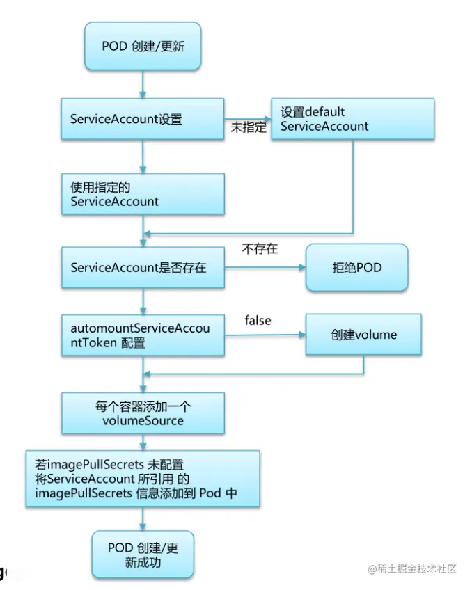 2) 校验指定的ServiceAccount是否存在:否则拒绝该Pod。