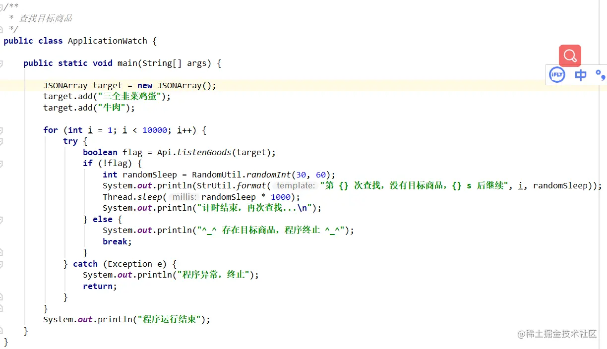我在接口的返回里一直拿到list这个节点,这里面都是商品。然后简单粗暴转为字符串,再遍历我的目标商品,看看是否存在,存在就播放一分钟铃声,返回true。