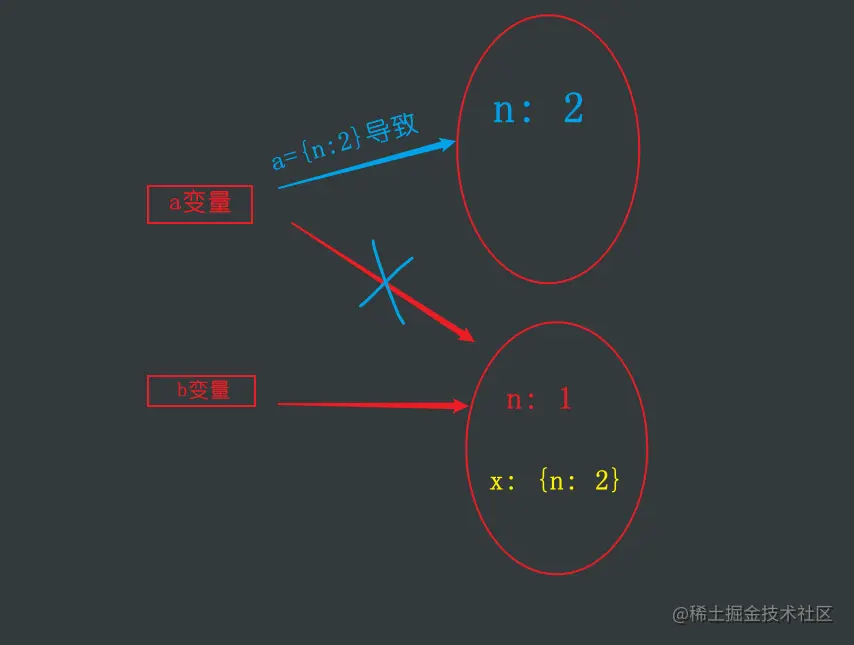 a = {n: 2},就是让 a 这个变量,指向一个新的对象{n: 2},注意,不是之前那个和b共同指向的对象了哦! - 返回了什么?