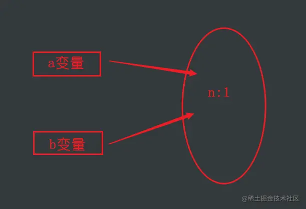 于是呢,变量b和变量a 存储的都是同一个地址,那么它俩自然就是指向同一块内存空间,也就是a 和 b 都指向{n: 1},正如上图中画的那样。
