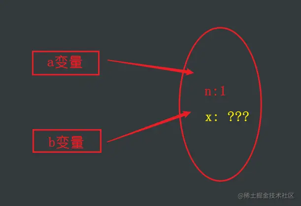 注意,let b = a 代表的是把变量a的值,赋值给变量b,而变量a的值是啥?有一点JS基础的同学都知道,a变量存储的并不是对象{n: 1} ,而是指向对象{n: 1}的一个指针,也就是一个内存地址。