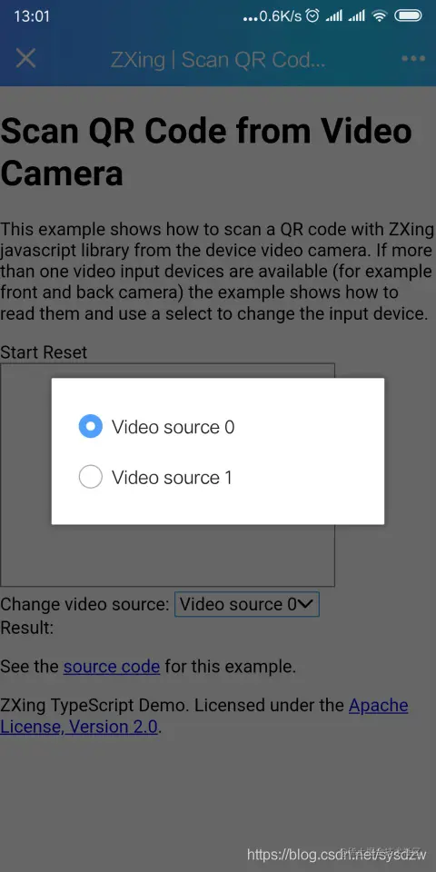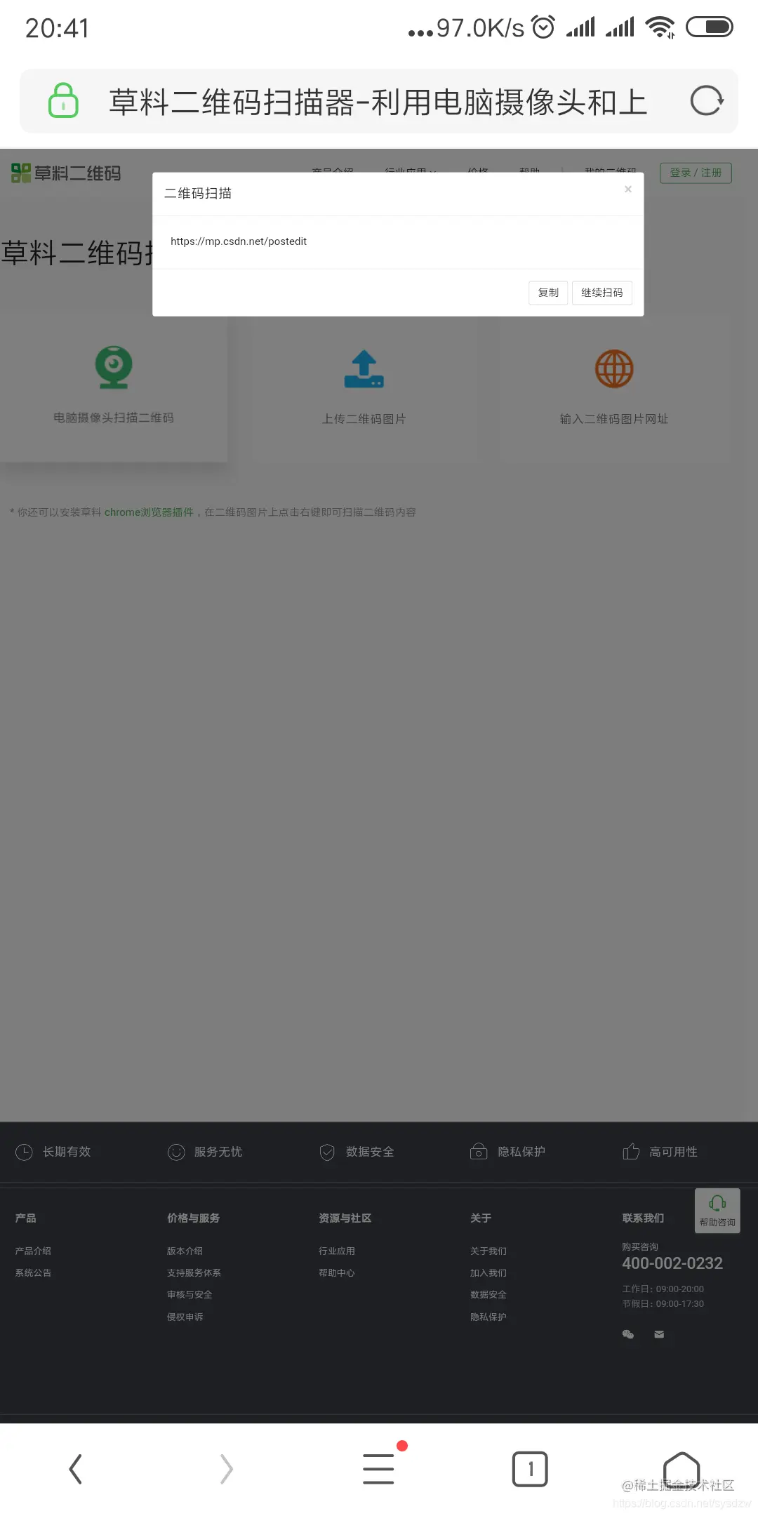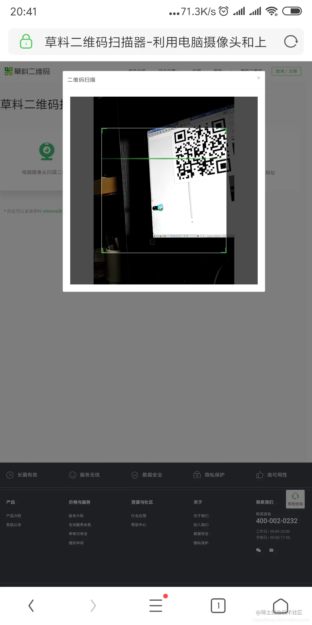 后来看到草料网上的效果实现得很不错,可惜是调用前置摄像头的,不知道只能前置还是可以设置的,大家可以用手机访问草料二维码解码器来测试。