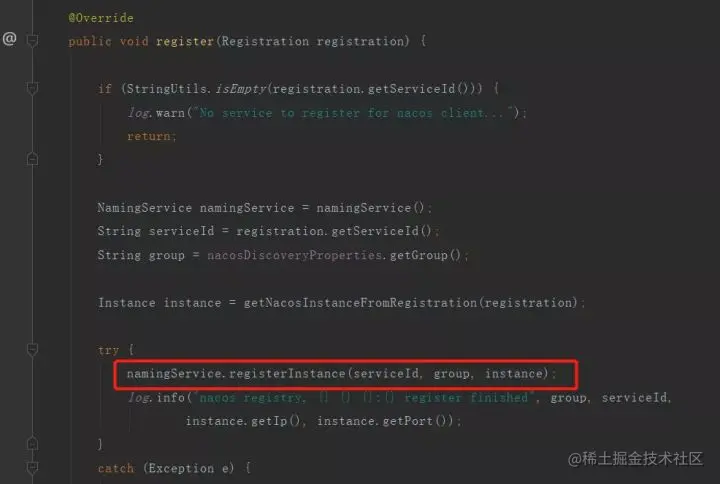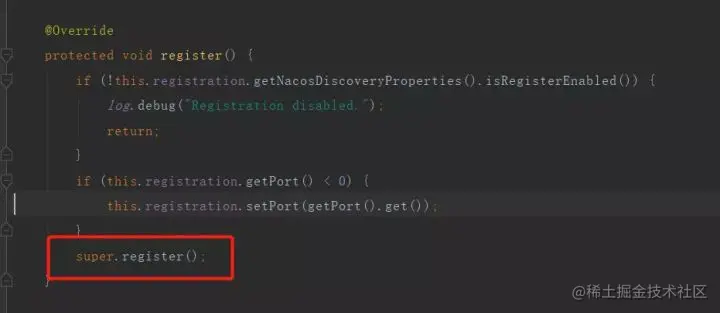 nacos的实现重写了springcloud提供的register方法,我们看一下重写的方法