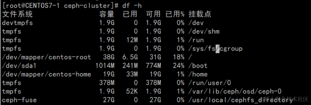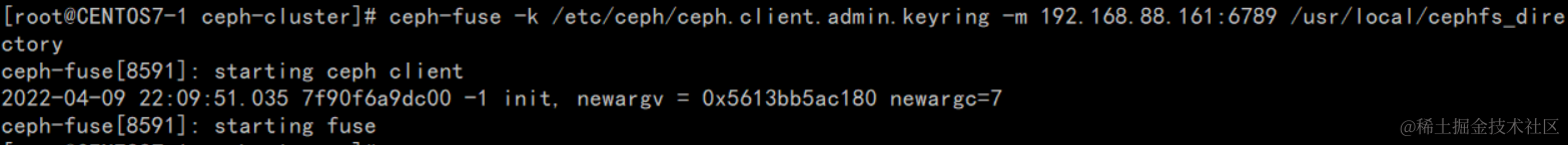 ceph-fuse -k /etc/ceph/ceph.client.admin.keyring -m 192.168.88.161:6789 /usr/local/cephfs_directory