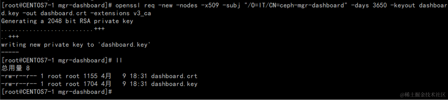 openssl req -new -nodes -x509 -subj "/O=IT/CN=ceph-mgr-dashboard" -days 3650 -keyout dashboard.key -out dashboard.crt -extensions v3_ca