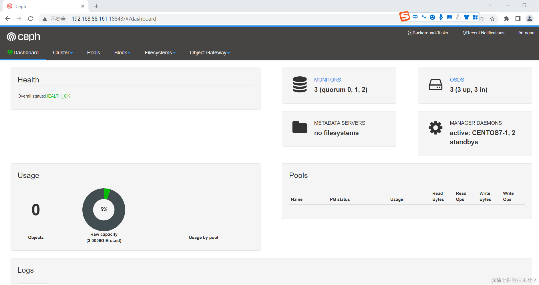 集群创建完后, 默认没有文件系统, 我们创建一个 Cephfs 可以支持对外访问的文件系统。