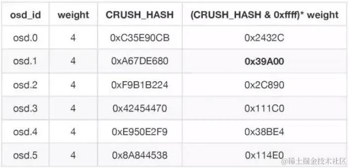 假设常数 r=0 ,根据算法 (CRUSH_HASH & 0xFFFF) * weight 计算最大的一个 OSD ,结果为 osd.1 的0x39A00,也就是选出的第一个 OSD ,然后再让 r=1 , 生成新的 CRUSH_HASH 随机值,取得第二个OSD,依次得到第三个 OSD 。