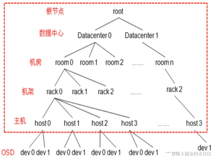Crush Map 将系统的所有硬件资源描述成一个树状结构,然后再基于这个结构按照一定的容错规则生成一个逻辑上的树形结构,树的末级叶子节点device 也就是 OSD ,其他节点称为 bucket 节点,根据物理结构抽象的虚拟节点,包含数据中心抽象、机房抽象、机架抽象、主机抽象。