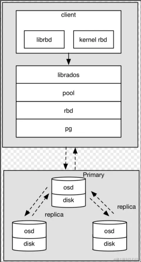 - 客户端与primary OSD建立SOCKET 通信,将要写入的数据传给primary OSD,由primary OSD再将数据发送给其他replica OSD数据节点。