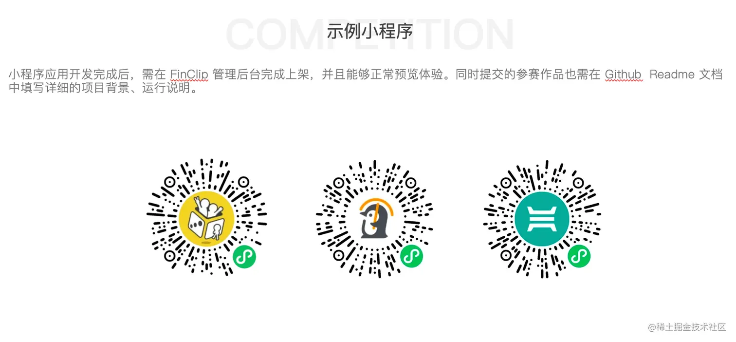 应用组需基于FinClip的SDK开发一款应用,在这款应用中需要具备小程序运行的能力。该赛道有两种参赛方式:1、从0到1做一款全新的应用,应用中有1~2个功能通过小程序实现。2、基于FinClip官方应用进行移动改造,试想你是FiClip 官方应用的设计者,你会如何设计,你可以从ui设计、功能的填充等等方向去进行拓展。
