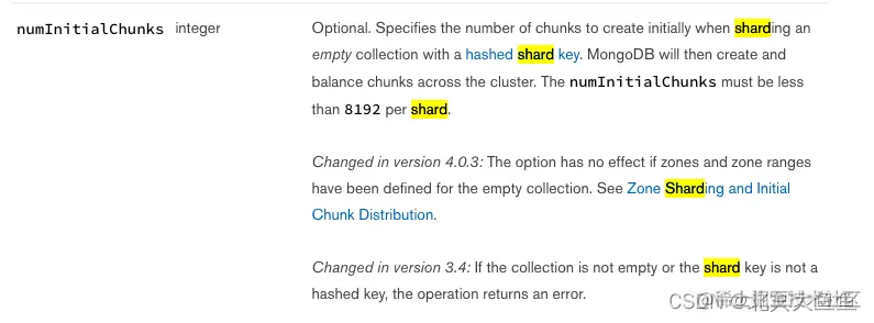 注:这里的预分片已经等效于给集合开启分片了;这个操作只有第一次生效,即如果执行了第7步后再过来执行预分片就不会有效果了。原因很简单:对集合开启分片之后,chunks数就已经确定了,这个时候在尝试预分片也就没用了。