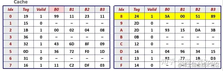 第八组有一个条目,它的标记位是 24,这里是一次缓存不命中。