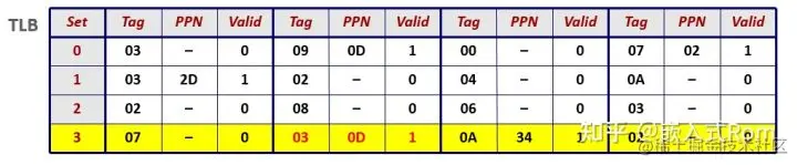 遍历这 4 个条目,有一个标记位为 7 的项,但它不是我们想要的,它的有效位为 0。再往后找,找到一个标记位为 3 并且有效位为 1。