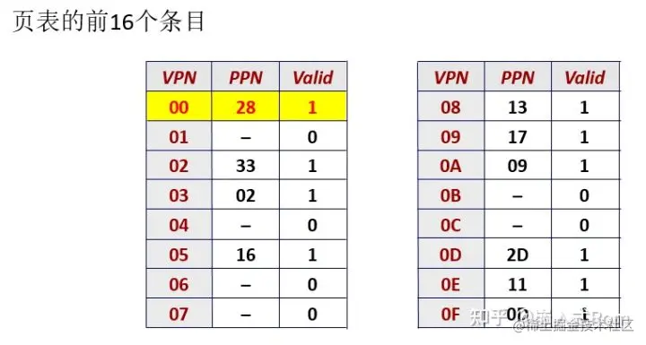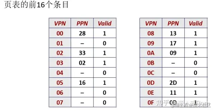 现在,我们还需要页表。假设,图中是我们页表的前 16 个条目。每一个页表有一个物理页号和一个有效位。